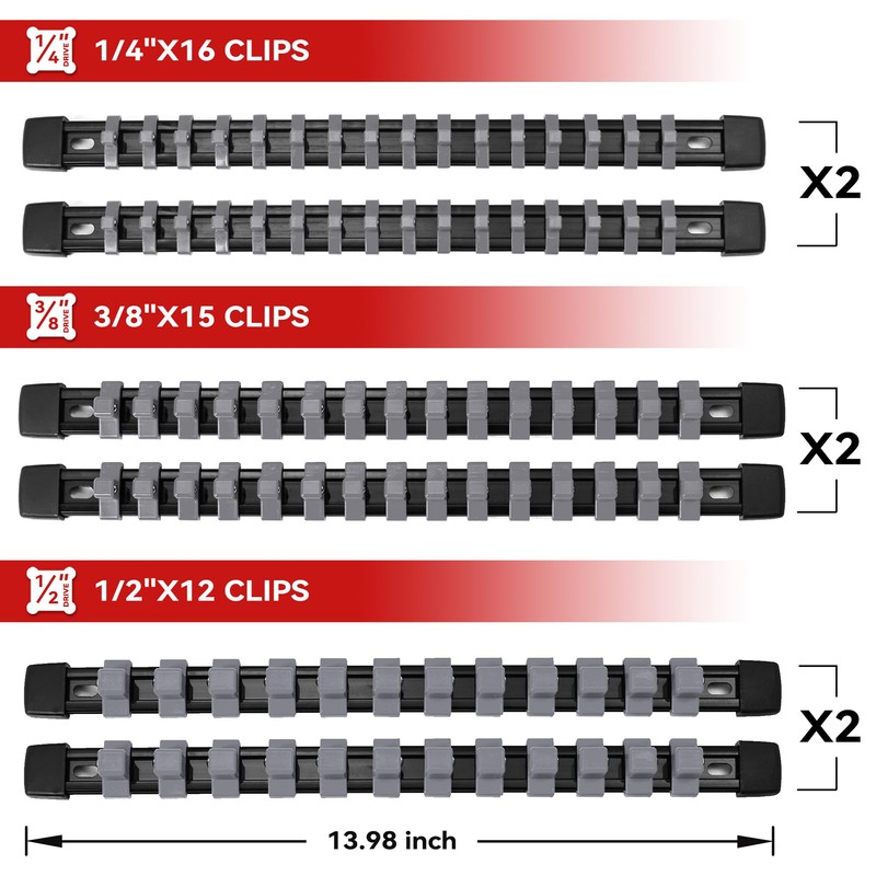 - High Capacity: Holds up to 172 sockets in gray. This organizer for sockets is equipped with 48 1/2-inch drive clips ,60 3/8-inch drive clips and 64 1/4-inch drive clips.