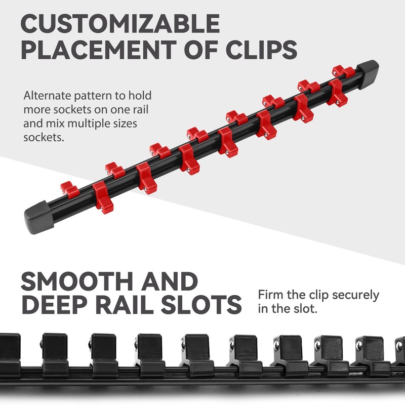 - Removable End Cap Design: Clips can be easily added or removed to meet your DIY needs for multiple sizes on a single rail. Also makes it easier for you to remove the clips to clean the socket rail organizer.