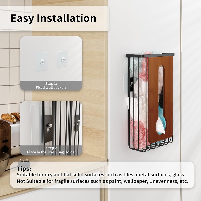 - 【Easy Installation】This grocery sack holder comes with an easy-to-install design that requires no drilling or tools. Simply mount it onto your kitchen cabinet door, pantry, or wall with the provided adhesive backing, and you'll have a convenient, sturdy storage solution within minutes. Perfect for renters or those who want a no-fuss setup.