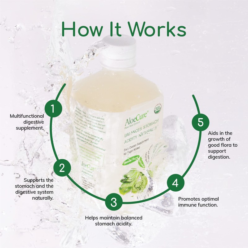 - HOW IT WORKS: Our Pure Aloe Vera Juice acts as a multifunctional digestive supplemetn, supporting balanced stomach acidity and overall digestive function, but not changing stomach pH enough to trigger the release of more acid. Aloe is known to be safe and effective for external and internal wellness and has been used in traditional medicines for thousands of years. Internally, it helps to promote the growth of good flora to support digestion.
