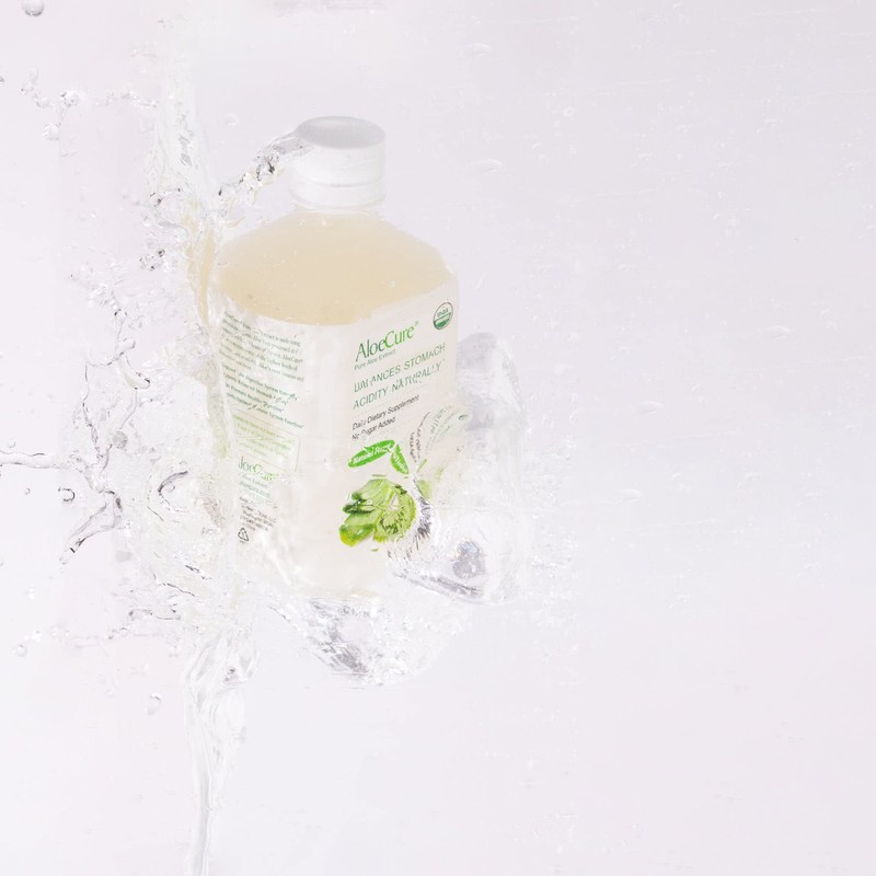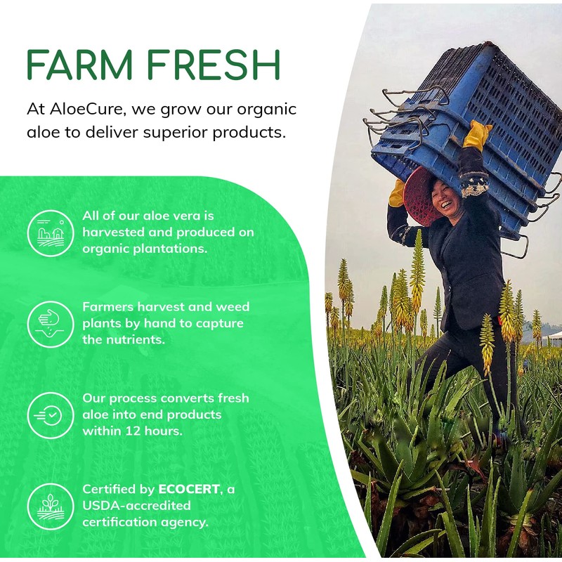 - ALOECURE Quality: AloeCure Aloe is grown on AloeCure's own Certified Organic Farms and is processed within 12 Hours of Harvest in AloeCure's own facilities, ensuring quality at every step of the process and most nutritious aloe possible for our Customers. We use only the inner leaf of Gel and a proprietary low temperature process free of chemicals to remove aloin. We never use charcoal filtration or enzymes, which is why our juice is still in its natural color in the bottle.