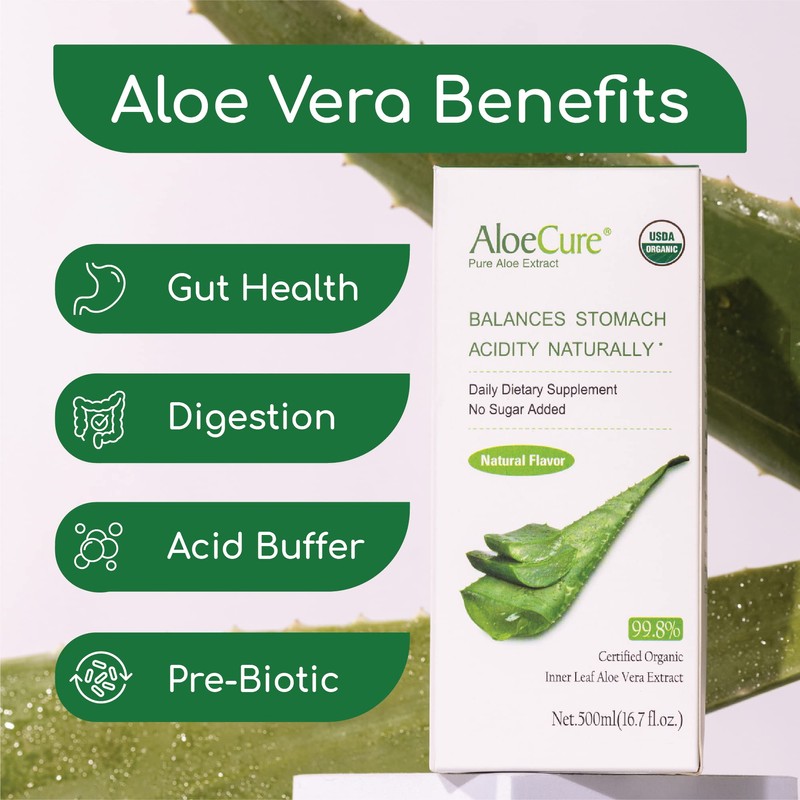 - SUPER SUPP: AloeCure Pure Aloe Extract is 99.6 percent inner-gel aloe vera that is never made from concentrate or powder. Aloe is proven to support digestive wellness, help maintain balanced stomach acidity, act as a digestive aid, and support immune health. The Aloe used in the Pure Aloe Extract comes from certified organic farms and each serving is equivalent to 60,000mg of Aloe Vera.