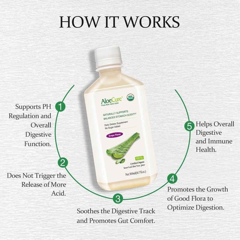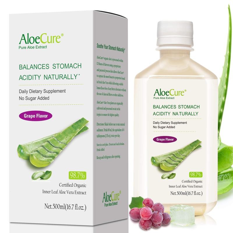 Digestive Harmony & Vitality: Fuel your body with the vital nutrients found in our Organic Aloe Vera Juice, boosting your overall wellness and vitality while combating elevated stomach acidity. AloeCure organic aloe vera juice for drinking is 98.7 percent inner-gel aloe vera that is never made from concentrate + organic grape extract.