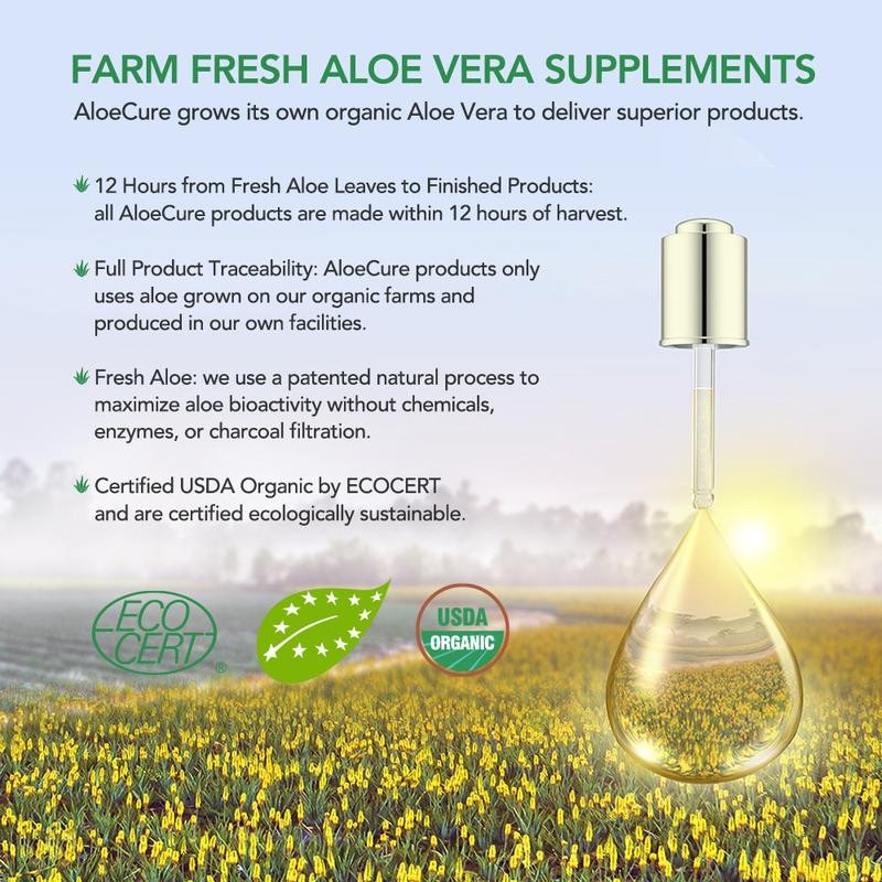 Made Within 12 Hours of Harvest: AloeCure USDA Organic Aloe Vera Juice from inner leaf gel is made using a proprietary natural process without the use of charcoal filtration, chemicals, enzymes, or fractional distillation. Replenish your body from the inside out with our Aloe Vera Juice, nourishing your skin, improving your digestion and immune system.