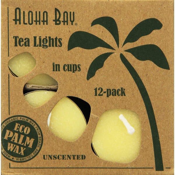 Aloha Bay Palm Wax Tea Lights with Aluminum Holder Cream Description: 12 - Tea Light Candles. 100% Vegetable Palm Wax. Unscented. Exceptionally Clean Burning. Pure Cotton Wick. Hand Poured in Indonesia. Long Burning: More than 5 Hours. Disclaimer: These statements have not been evaluated by the FDA. These products are not intended to diagnose, treat, cure, or prevent any disease.