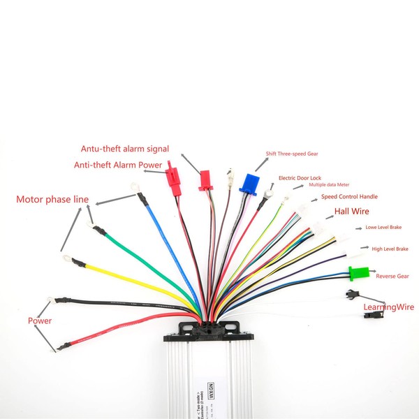 - Multifunctional: for power supply, power supply Li-ion, electric door lock, motor phase line, hole line, acceleration of the line, the three-speed lines, low level brake lines, high brake line, general instrument line, anti-theft alarm, the power cord, anti-theft alarm signal lines, cables for reversing, intelligent detection of learning processes.