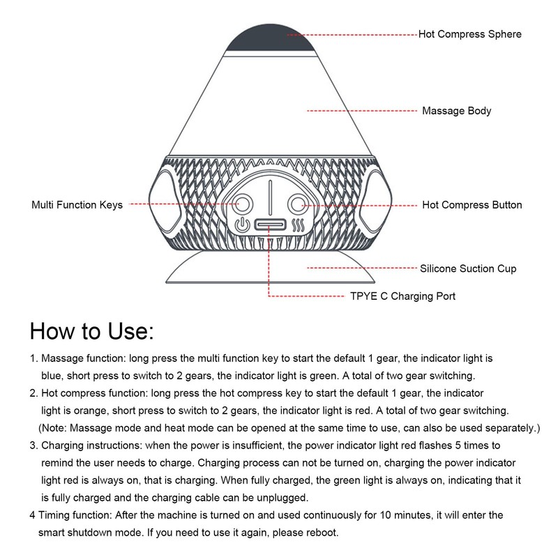 [Convenient Design] Equipped with a suction cup, this massage ball easily attaches to various surfaces for self-massage anytime, anywhere.[Comprehensive Relaxation] With dual-mode vibrating massage, this ball targets back, shoulders, neck, and more to provide a complete relaxation experience.[Adjustable Heat Settings] The mountable massage ball offers 2 temperature options for facial heat compression, promoting circulation and relieving fatigue.[Auto Shutoff Feature] Ensuring safety and efficiency, the massage ball automatically turns off after 10 minutes of use, easily restartable for extended sessions.[Premium Materials] Made of silicone and pc, this massage ball offers a gentle touch for a soft and skin-friendly massage experience, along with a type c charging interface for convenience.Spec:Item Type: Mountable Massage BallMaterial: Silicone, PCWeight: Approx. 159g/5.6ozMaximum Power: 4WCharging Time: About 2 hoursBattery: 600mAh (shipped with built in battery)Package List:1 x Mountable Massage Ball1 x Instruction Manual1 x Charging Cable