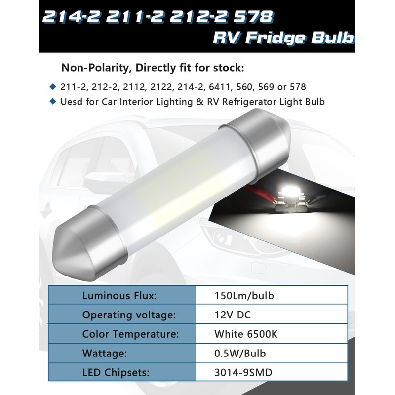 - 【Great Value】6pcs 41mm 578 led bulb included, a single purchase can be used for a long time. This 214-2 bulb fridge can be used for rv, camper, trailer, motorhome refrigerator light bulb. Also, if you need to use it on auto interior lights, it is okay
