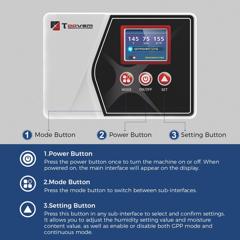 • Large LCD Display with Instant Readouts – Features a clear, easy-to-read screen that shows humidity levels, temperature, and system status at a glance, with intuitive symbol indicators for quick reference