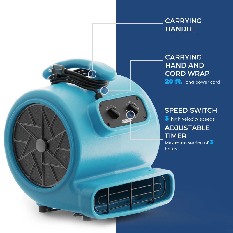 - PROFESSIONAL AND RELIABLE - Designed for commercial and industrial settings, This Alorair air mover includes a 20 ft. long power cord and timer for easy use. Its durable PP housing ensures reliability during large-scale drying, cleaning, and restoration projects. Combine it with Alorair's air scrubbers and dehumidifiers for a comprehensive water damage restoration system.