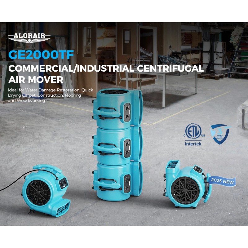 - FASTER SURFACE DRYING! - The Alorair GE2000TF Air Mover features an advanced centrifugal design with three adjustable rotational airflow options, ensuring maximum efficiency for fast drying of carpets, floors, furniture, windows, and walls. Up to 2000 CFM airflow, making it ideal for drying flat surfaces and tight areas.