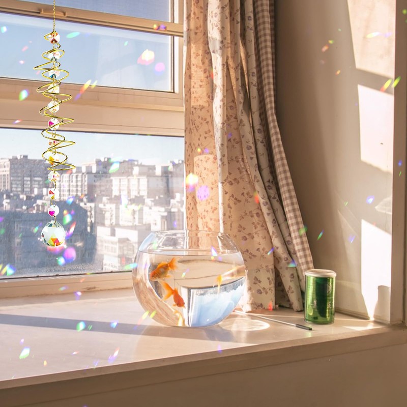 - Crystal Suncatcher The suncatcher crystal wind chime is composed of 11 octagonal chakra crystals and a crystal ball, which seemingly moves up and down when rotating the special double textured spiral tail, creating a magical optical illusion.