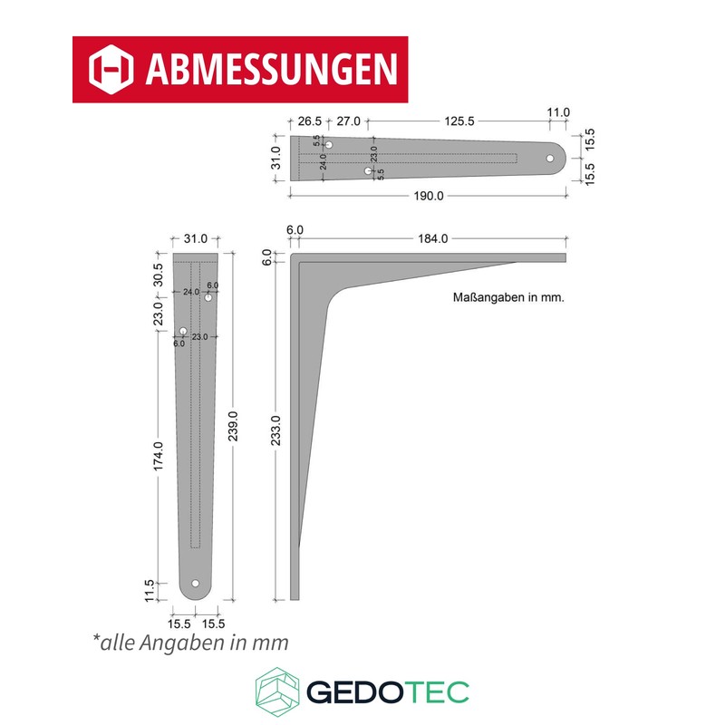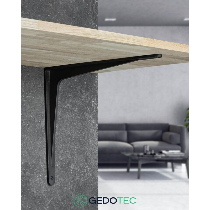 - Specifications: The dimensions of the modern and trendy console brackets are 240 x 190 x 32 mm. It has the colour matt black and is made of aluminium. Thanks to the strong durable and rust-proof material that is used, the console can hold high loads. The mounting type of the high-quality corner brackets for shelves depends on the wall material: please check screws and dowels for support angle according to the wall condition before installation.