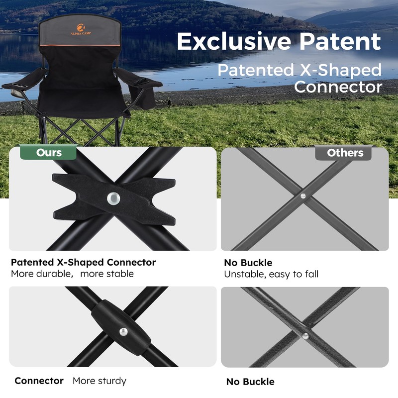 - 【Durable & More Stable Camping Chairs】ALPHA CAMP camping chair features innovative X-shaped reinforcement design,There are also X-shaped plastic reinforcements and plastic pipe sleeves on the sides, making the chair more load-bearing and stable((up to 225 LBS).The bracket pipe is hammer tone powder coating,rust and scratches are prevented.