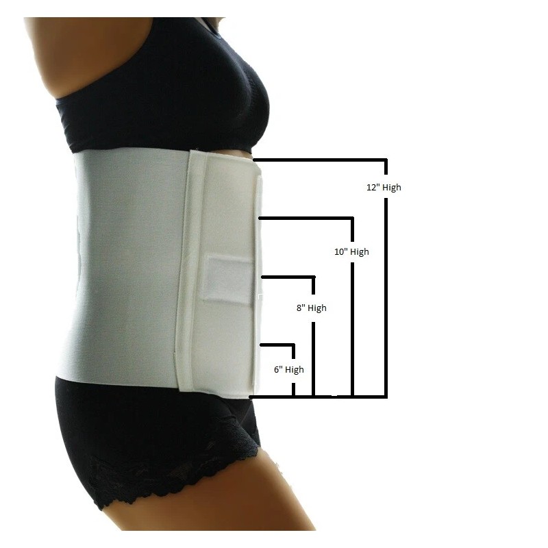 The Triple Closure Abdominal Binder is available in two sizes, small & large, and three widths; 8, 10, 12 inches wide. The size is a measurement of your waist around your body while the width is a measurement of the height of the abdominal binder vertically on your body when you have the binder on. Custom manufacturing is available if you are outside our standard size range. See size guide below.