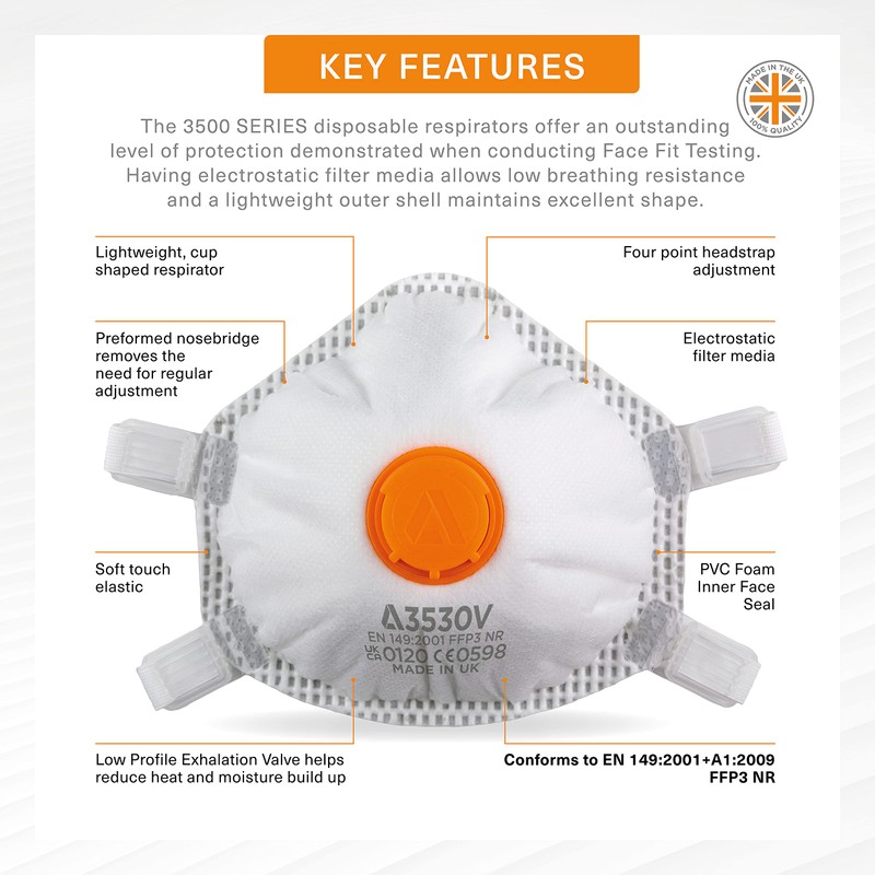 Alpha Solway 3530V Lightweight UK Made Pack of 5 Latex Free FFP3 Valved Disposable Respirators EN 149:2001+A1:2009 FFP3 Masks UK Certified Cup Shaped Dust Mask Respirator Single Use