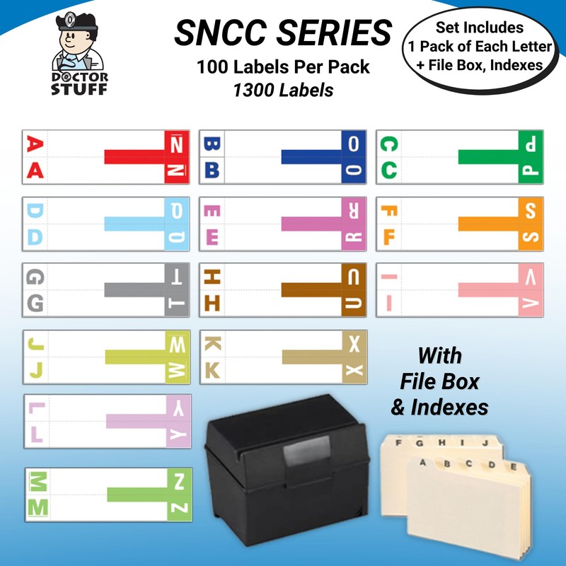 Alphabet Labels for File Folders, A to Z Complete Set with File Box and Indexes, Doctor Stuff, 100 Stickers of Each Letter, 1300 Labels, Compatible with Smead SNCC Series, Medical Chart Labels