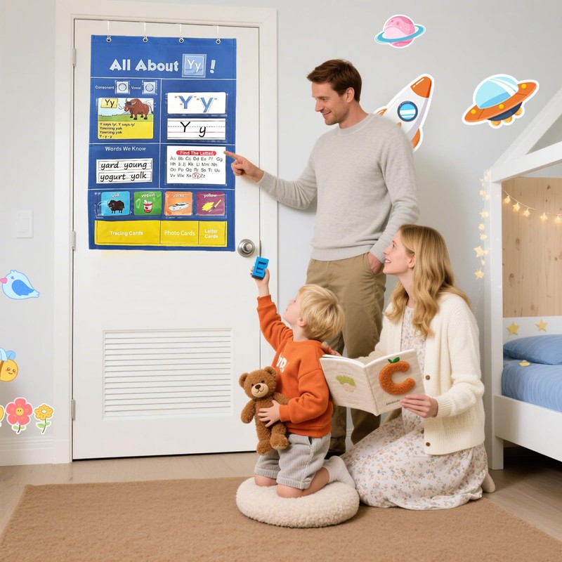 - Ultimate Homeschool & Classroom Center Kit: Includes reusable cards (letter/word/tracing cards + alphabet chants) + 4 over-door hooks + 3 storage pockets. Ideal for group centers, letter-of-the-week lessons, and kindergarten learning games - all in one classroom wall chart