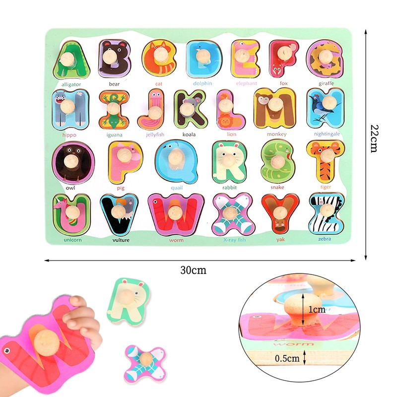 - 26 PCS Wooden Alphabet Peg Puzzle: Spark your toddler’s love for learning with this colourful alphabet puzzle set! Each of the 26 wooden alphabet letters is easy to grasp, helping little ones master their ABCs through interactive play that builds early literacy skills