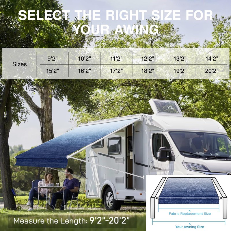 - [Perfect Fit Guaranteed] - The replacement fabric for RV awning is available in multiple size options ranging from 9'2" to 20'2", ensuring compatibility with most RVs. Measure the distance between the center of the awning arms from left to right before purchasing to select the perfect size for your camper. For example, if your RV awning measures 16', choose the 16FT option (fabric 15'2").