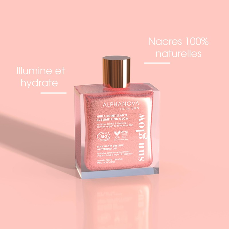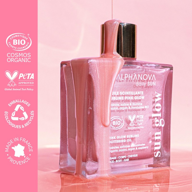 - Feines schimmerndes PINK GLOW Öl: Das Sublime Shining Pink Glow Öl Alphanova Daily Sun spendet Feuchtigkeit und Satin der Haut dank seiner natürlichen Perlmutt in Rosa und Gold. Die Haut wird gepflegt, geschützt und sublimiert.
