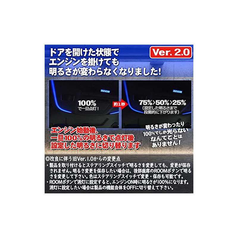- Changes from the old version due to improvements; When the product is installed, changes will not be saved even if the brightness is changed with the steering switch. If you want to save the brightness change, please change the brightness by the ROOM button in the back seat. The color can be changed and stored with the steering switch. When the ROOM button is set to turn off the light, it will be 100% brightness when the engine is on. If you want to set it to off, please switch the function of the product to OFF