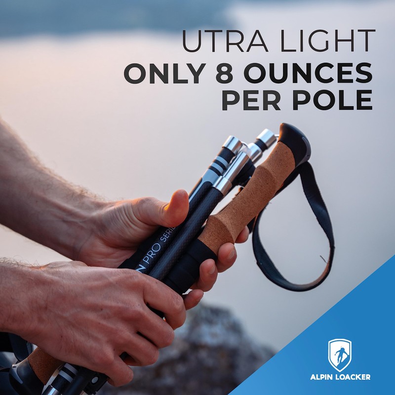 - 🌲[ Shatterproof and ultra light hiking poles ] - These collapsible hiking poles for men and women play in the top Mountain Equipment league. The carbon trekking poles weigh only 8 ounces each and are extremely stable and break-resistant. With patented push button design - No slipping together as with conventional manufacturers!