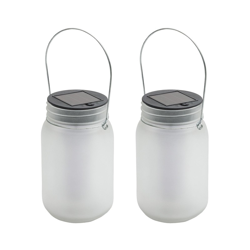 - GLOWING SOLAR AMBIANCE: Includes 2 illuminated frosted glass jars with flickering flame to light up your outdoor living space by either hanging or sitting on a flat tabletop or surface.