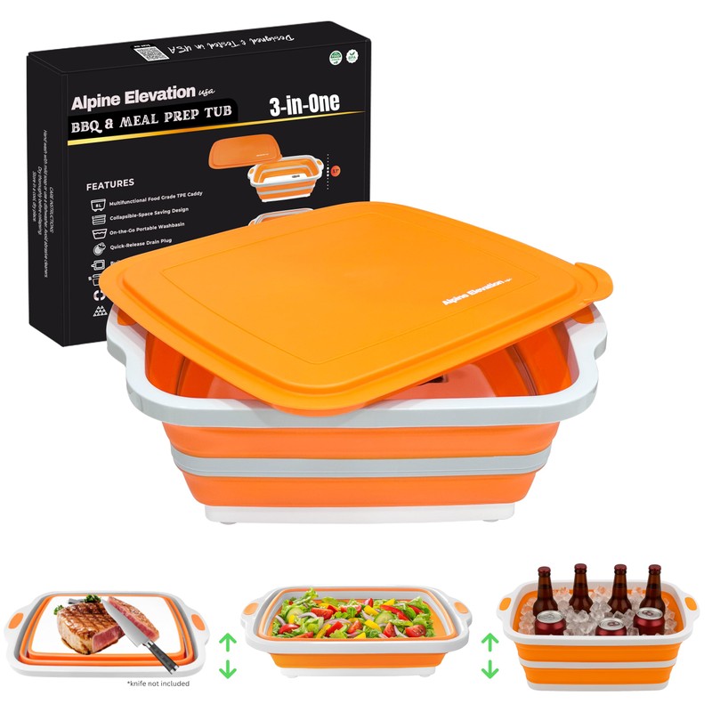 Alpine Elevation Collapsible Large (8L) BBQ Marinating Tub w/Prep Board, Multi-Function Grill Caddy w/Colander & Lid, Portable Silicone Dish Bowl for Picnic, Tailgate, Camping - Bold Orange
