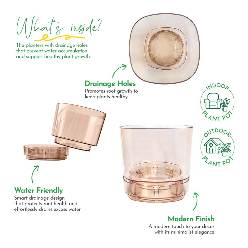 - ✔ Amber-Tinted Transparent Body The warm caramel hue allows light to reach roots while letting you observe growth and hydration — a stylish twist on functional transparency.