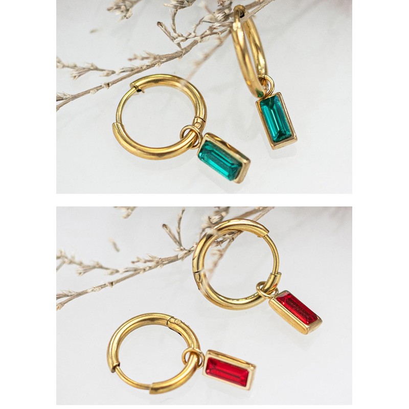 - Elegant 18K Gold Plating: Elevate your style with 18K Gold Plated Hoop Square Dangle Earrings, featuring vibrant emerald green, blue, red, and black cubic zirconia for a touch of luxury.