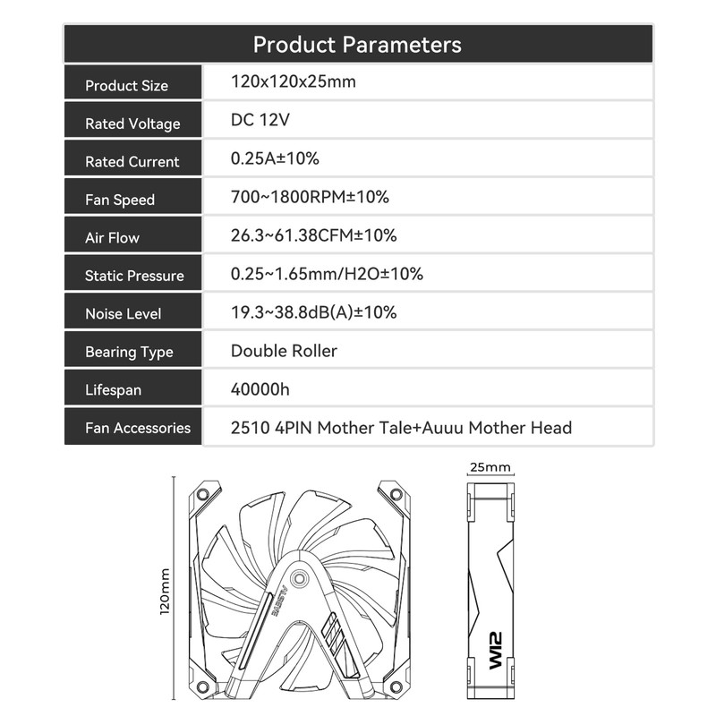 - W12 Pro case fan is built assembled with the FDB bearing which makes the fan working quieter and stabler.