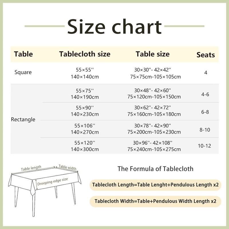 - Choose Your Tablecloth: Measure the size of the table, tablecloth rectangular is recommended to increase the table length by more than 20 inches (10 inches on one side) to get a better drop effect