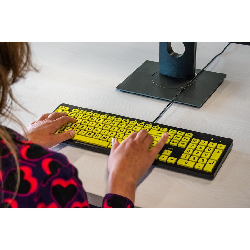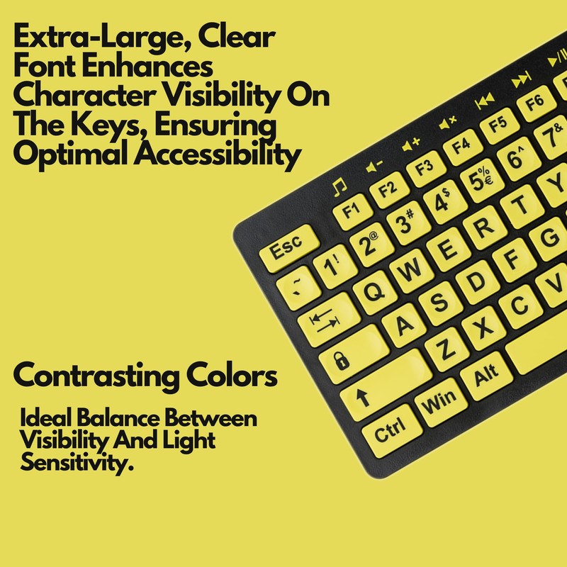 • High Contrast and Quiet Typing Experience - Boasting a high-contrast design with easy-to-see yellow key caps and bold black letters, this large print keyboard ensures increased visibility, even in low-light conditions. The membrane key switches offer a quieter typing experience along with a faster response, with a remarkable life cycle of 5 million keystrokes.