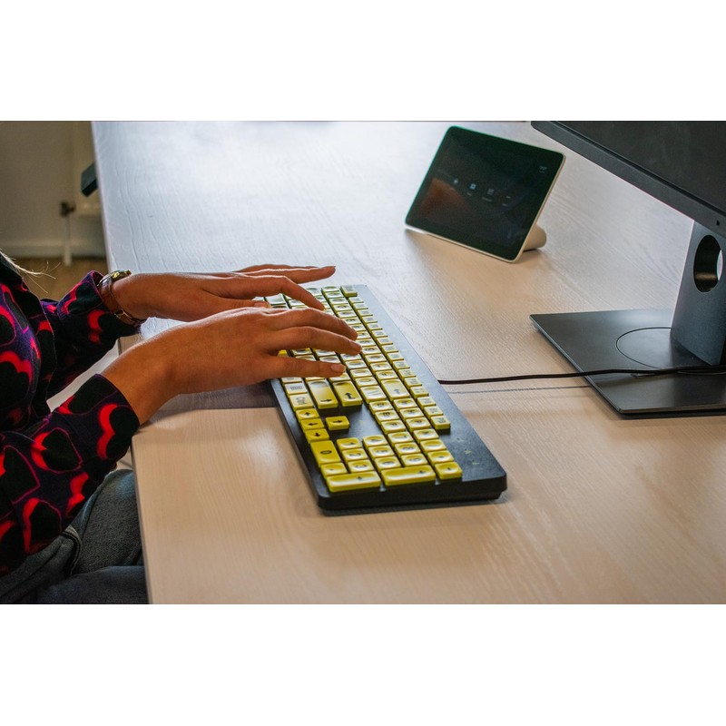 The elegant and sleek design of the Clearkeys is not only functional, but also gives it a design that matches today's aesthetic standards. There is space between all the yellow keycaps. Due to this the keyboard isn’t one big yellow block, but the keycaps themselves stand out and are easy to distinguish. The keycaps are also concaved. Due to this it is easier for feel where you are on the keys with your fingers. The keys and board itself are matted, so that reflection by ambient lighting is prevented. In addition, the red indication LEDS have been made extra bright for optimal visibility. Furthermore, the keyboard rests low on the surface, which improves the ergonomics.