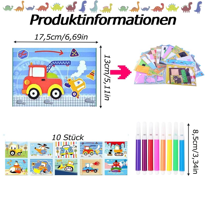 Jedes Motiv ist aufwendig gestaltet – vorderseitig mit Klebefläche, rückseitig zum Bemalen. Die bunten, detaillierten Fahrzeugdesigns fördern die Kreativität und laden zum Geschichtenerzählen ein.