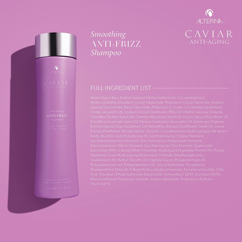 Product DescriptionCaviar anti-aging smoothing anti-frizz shampoo is formulated with a proprietary climate shield complex that controls humidity affecting hair to keep stands smooth and soft with less frizz for up to 72 hours.* Our pure caviar extract, rich in omega 3 fatty acids, proteins, minerals and vitamins A, C and D help visibly improve the signs of aging hair: manageability, breakage, dryness & dullness. A nourishing blend of Abyssinian, camellia & Avocado oils help to condition and smooth hair, restoring its strength & lustre.IngredientsWater/Aqua/Eau, Sodium Lauroyl Methyl Isethionate, Cocamidopropyl Hydroxysultaine, Disodium Cocoyl Glutamate, Potassium Cocoyl Glycinate, Sodium Lauroyl Sarcosinate, Decyl Glucoside, Potassium Cocoate, Cocamidopropylamine Oxide, Glycereth-26, Sodium Cocoyl Glutamate, PEG-120 Methyl Glucose Dioleate, Camellia Oleifera Seed Oil, Crambe Abyssinica Seed Oil, Oryza Sativa (Rice) Bran Oil, Passiflora Incarnata Seed Oil, Persea Gratissima (Avocado) Oil, Laminaria Digitata Extract, Glycine Soja (Soybean) Oil, Helianthus Annuus (Sunflower) Seed Oil, Caviar Extract, Panthenol, Phospholipids, Glycerin, Cocodimonium Hydroxypropyl Silk Amino Acids, Ascorbic Acid, Polysilicone-15, Saccharomyces/Copper Ferment, Saccharomyces/Iron Ferment, Saccharomyces/Magnesium Ferment, Saccharomyces/Silicon Ferment, Saccharomyces/Zinc Ferment, Superoxide Dismutase, PPG-3 Benzyl Ether Myristate, Hydrolyzed Vegetable Protein PG-Propyl Silanetriol, Guar Hydroxypropyltrimonium Chloride, Ethylhexylglycerin, Quaternium-91, Methyl Gluceth-20, Caprylyl Glycol, Polyquaternium-10, Polyquaternium-44, Polyquaternium-55, Glycol Distearate, Tocopherol, Pentaerythrityl Tetra-Di-T-Butyl Hydroxyhydrocinnamate, Tocopheryl Acetate, Citric Acid, Trisodium Ethylenediamine Disuccinate, Tetrasodium EDTA, Disodium EDTA, Phenoxyethanol, Potassium Sorbate, Sodium Benzoate, Fragrance (Parfum). (10-17-8470)DirectionsApply to wet hair, lather, massage into scalp, rinse thoroughly.