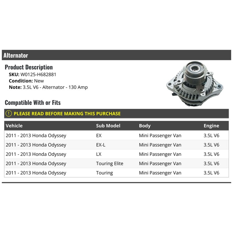 - Compatible with or fits: 2011 - 2013 Honda Odyssey LX Mini Passenger Van 3.5L V6 | 2011 - 2013 Honda Odyssey Touring Elite Mini Passenger Van 3.5L V6