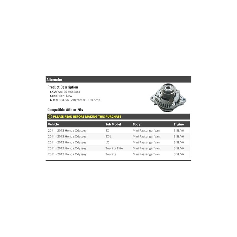 Alternator - 130 Amp - Compatible with 2011-2013 Honda Odyssey Mini Passenger Van 3.5L V6
