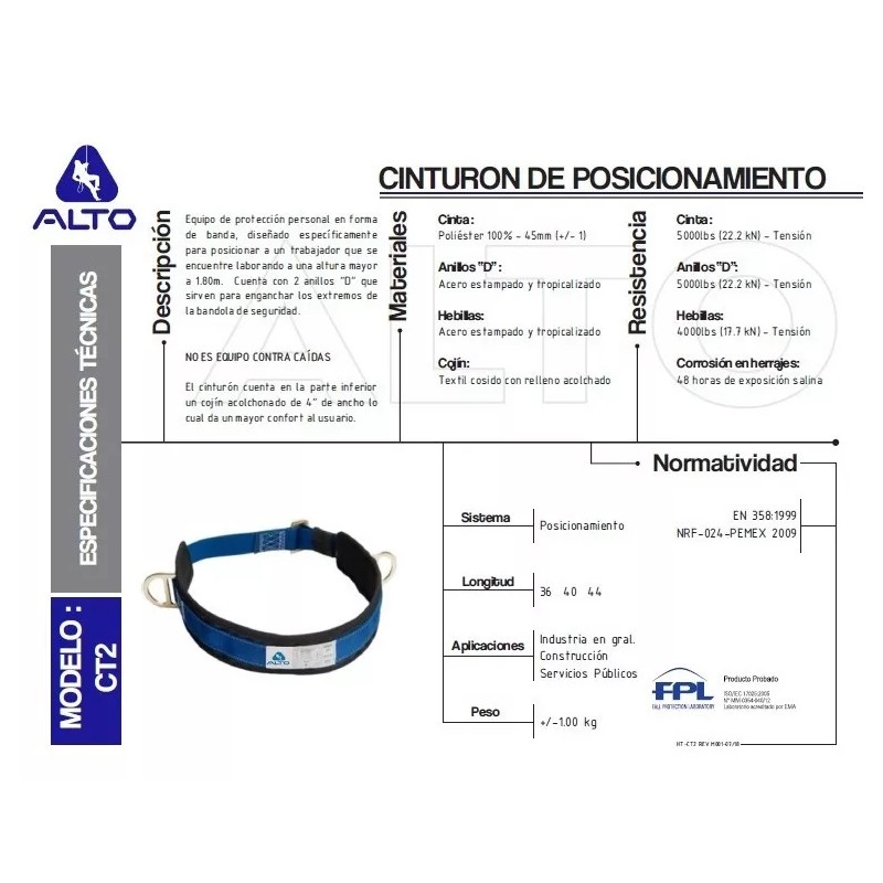 Equipo de protección personal en forma de banda, diseñado específicamente para posicionar a un trabajador que se encuentre laborando a una altura mayor a 1.80m. Cuenta con 2 anillos “D” que