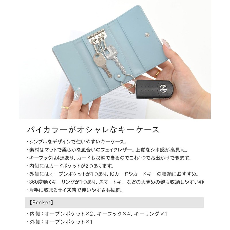 - Simple design and easy to use key case. The material is matte and faux leather with a soft texture. The high quality grain texture makes you look good. There are 4 key hooks that can also be stored for cards, so you can go out with this one piece. There are 2 card pockets on the inside, making it perfect for driving licenses and insurance cards. There is 1 card pocket on the outside, so it is recommended for storing IC cards and card keys. It has 1 key ring that moves 360 degrees, so it is easy to store larger keys such as smart keys