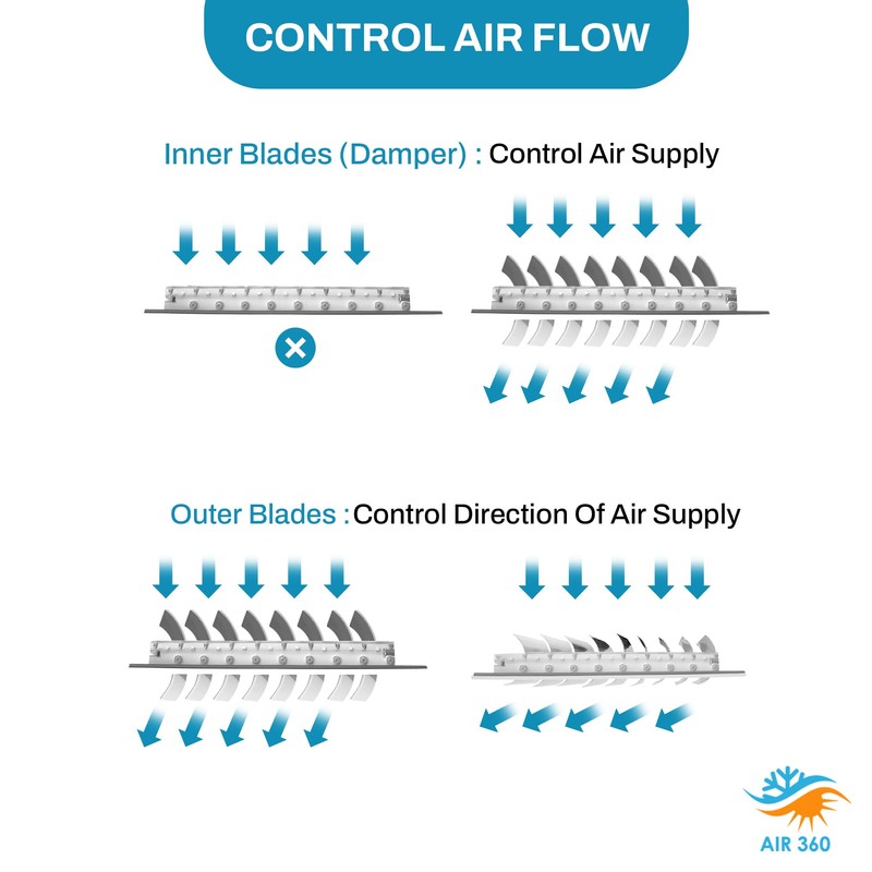 The fully adjustable blades are one of the outstanding features of the Air 360 AC ceiling grille. The innovative design with easy-glide damper not only allows you to adjust the blades for individual preferences and airflow requirements, but also gives you full control over the direction and intensity of the air circulation. No matter what Mother Nature is doing outside, you will enjoy comfortable, refreshing and evenly distributed airflow inside all year long.