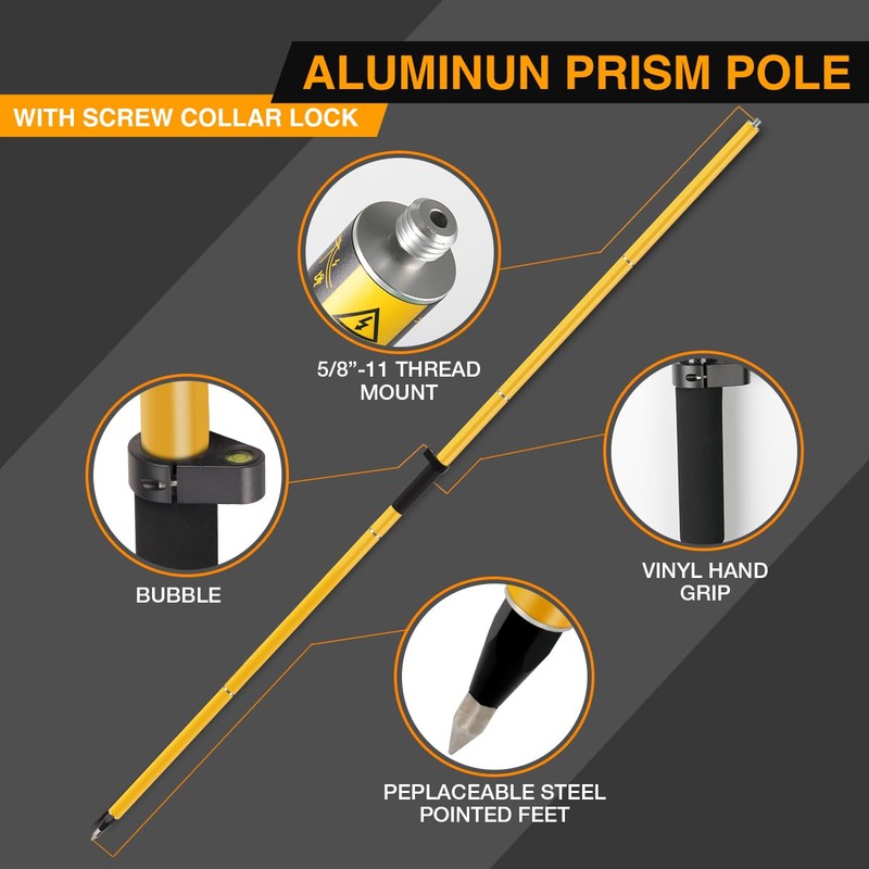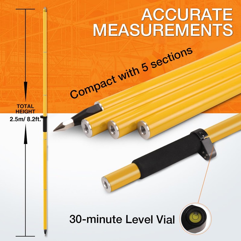 Aluminum 2.5M/8.2FT GPS Rover Rod Pole - 5-Sections Detachable Design for Land Surveying & Engineering - RTK/GNSS Accessory with Level Vial & Carrying Case (Yellow)