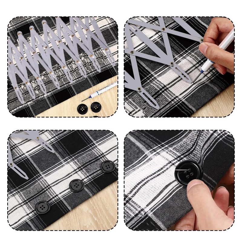 - Multifunctional: The expanding button gauge and guides for fabric measures multiple equal distances, allowing you to quickly and accurately place buttons, hooks, pleats on your clothes, for your sewing and marking needs on various occasions. Button guide spacing device can also be used for woodworking isometric marking. Marking positions quickly and accurately on boards of any width or length