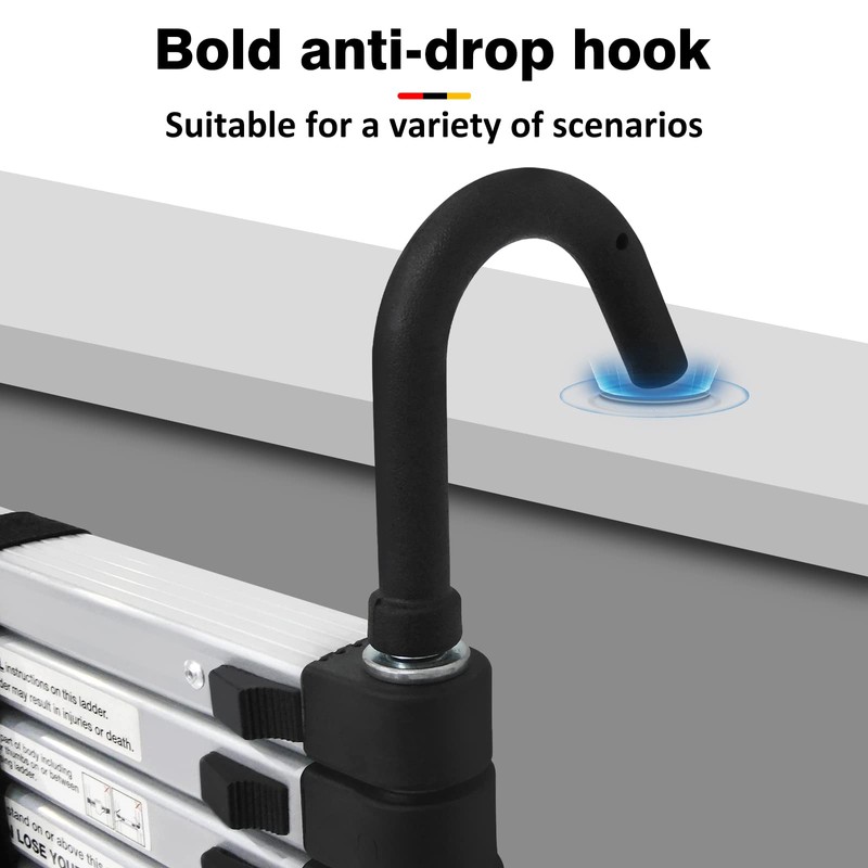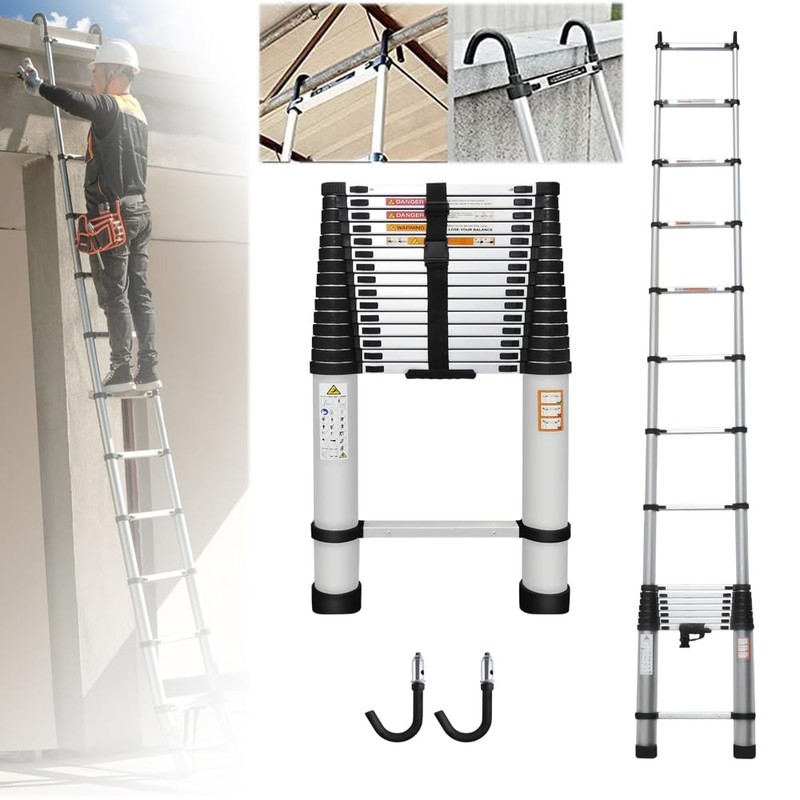 - ☑【Aluminium Telescoping Ladder 20.3FT】The telescopic extension ladder is made of high-quality waterproof aluminium alloy, with a sturdy frame and non-slip rungs, the maximum load of the telescopic ladder up to 330lb/150kg. 2 removable roof hooks can be hung on a pipe with a diameter of less than 2.8 inch, made access to the attic or roof much safer.