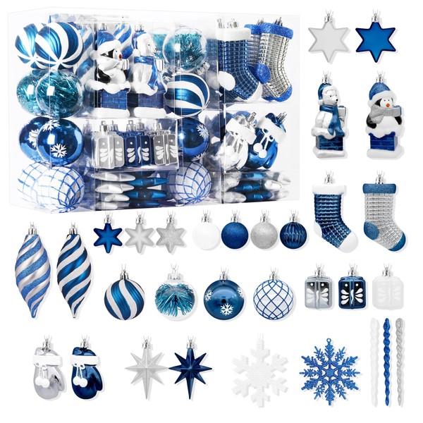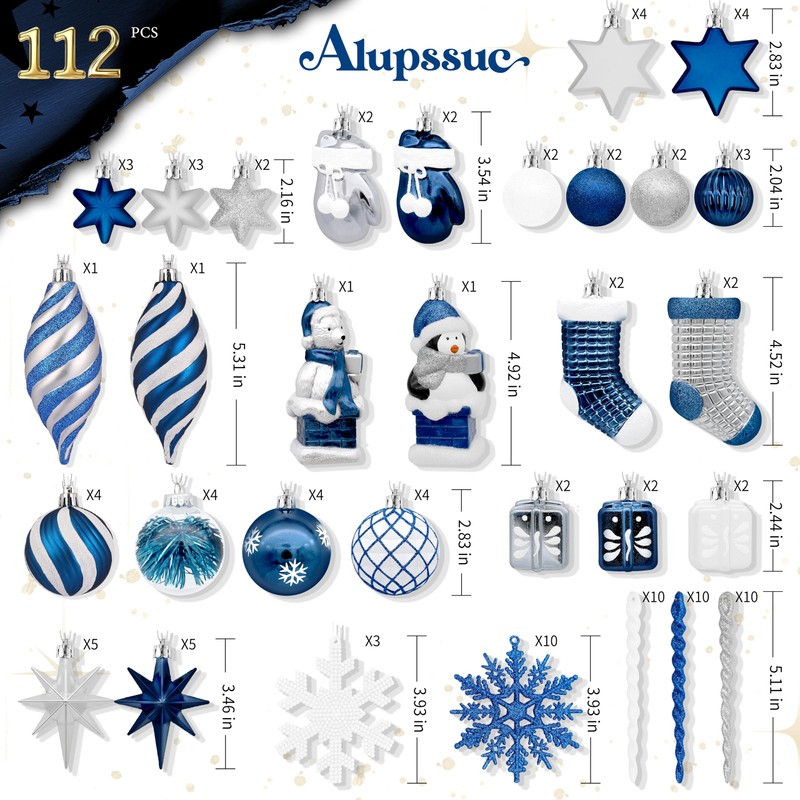 Alupssuc 112pcs Christmas Balls Ornaments Set, Shatterproof Plastic Baubles Christmas Penguin, Polar Bear for Xmas Tree Holiday Wedding Party Decorations with Hanging Strings, Bule and White