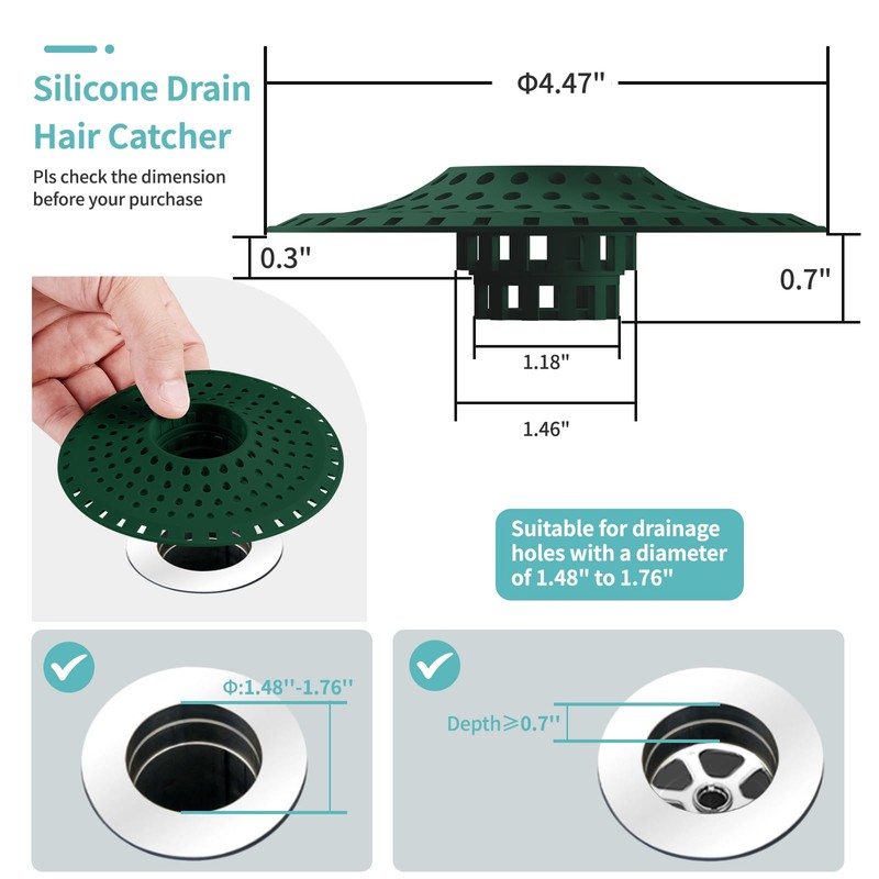 - Premium silicone construction: This bathtub drain hair catcher protector is crafted from high-quality silicone, making it both flexible and durable. With a 4.47-inch diameter, it fits drains measuring between 1.48" and 1.76", offering a reliable solution for most standard-sized drains.