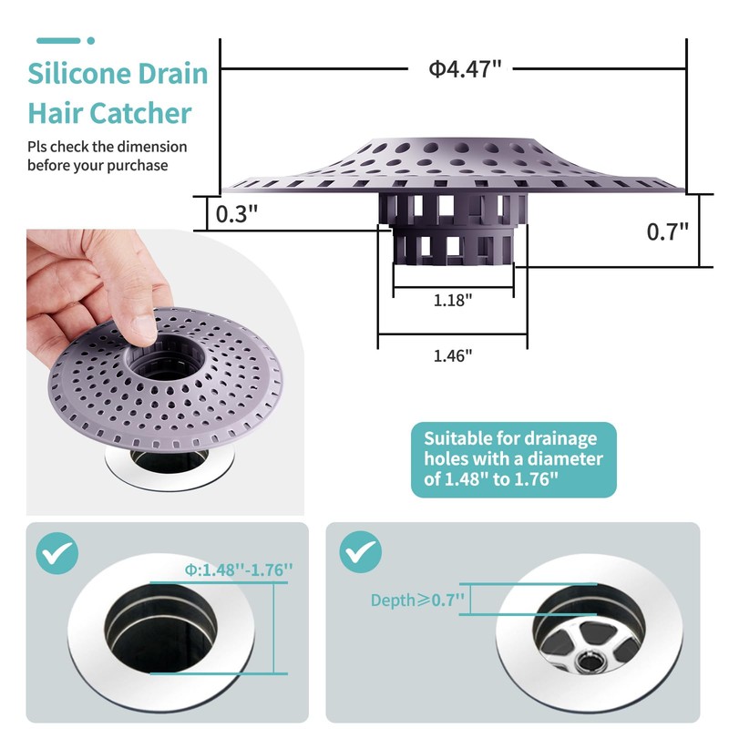 - Premium silicone construction: This bathtub drain hair catcher protector is crafted from high-quality silicone, making it both flexible and durable. With a 4.47-inch diameter, it fits drains measuring between 1.48" and 1.76", offering a reliable solution for most standard-sized drains.