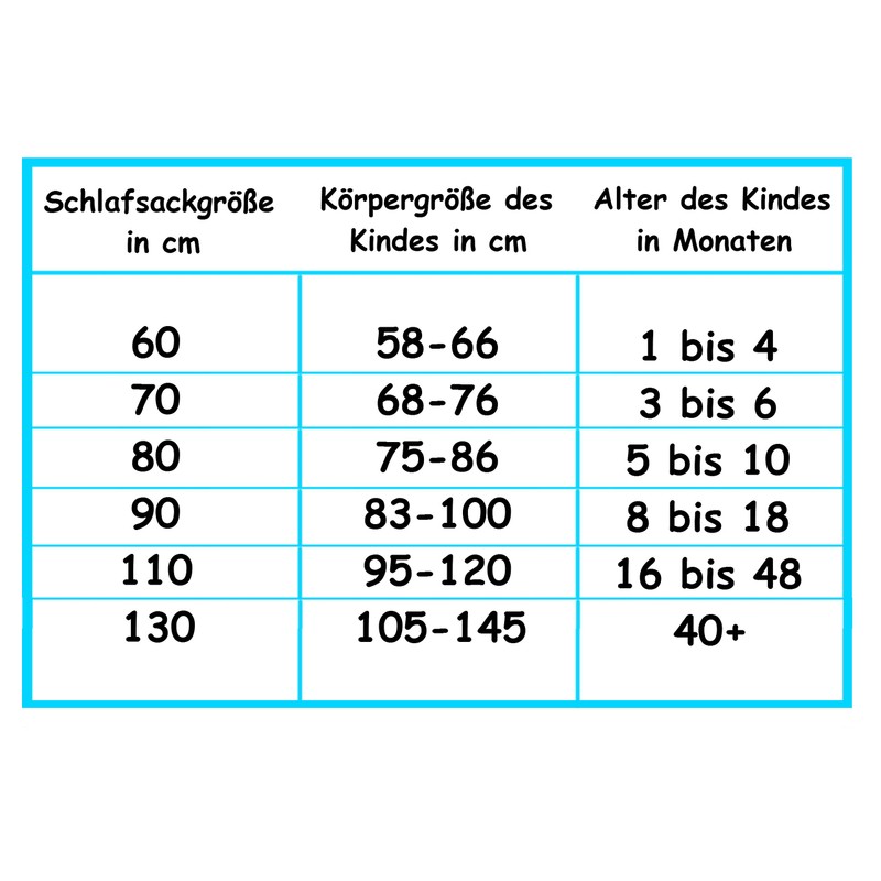 - Length of baby sleeping bag – please measure the child from the feet to the shoulders in cm and add 5 cm. Do not buy any larger as otherwise your baby will freeze in the oversized Alvi sleeping bag or the neckline will be too large and the head can disappear.