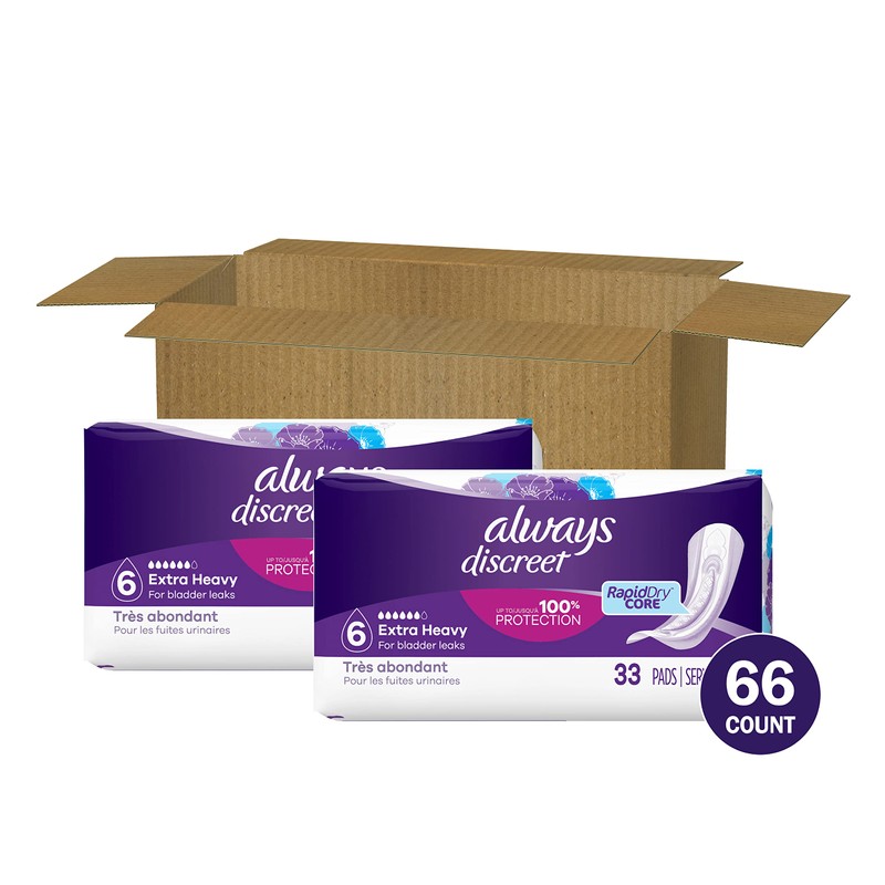 Always Discreet Adult Incontinence & Postpartum Pads For Women, Extra Heavy Overnight Absorbency, Regular Length, 33 Count x 2 Packs (66 Count total)